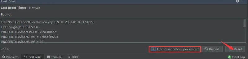 13. 重启goland后我们再点击Help-->Eval Reset查看相关信息,发现上一次重置时间与下一次过期时间都有了变化,即重启后会重置30天时间,相当于永久pojie,到此正常使用即可,以后都无需操作,非常稳定!