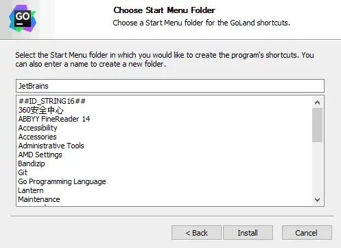 在开始菜单中为 Goland 的快捷方式选择一个文件夹,这一步我们不需要修改,直接点击 Install。
