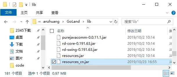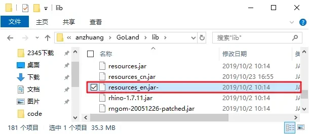 然后,同样在 lib 目录中找到“resources_en.jar”文件,它是 Goland 内置的一个英文补丁,这里需要将它删除或者重命名,建议大家选择重命名的方式,因为想要恢复英文的话还需要用到它。