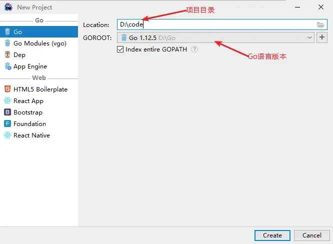 选择一个目录作为项目的根目录,并选择合适的Go语言版本,点击“Create”完成创建。