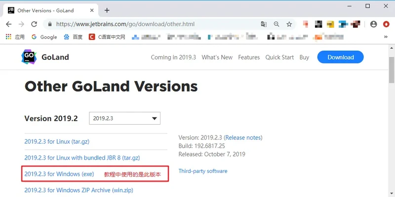 大家可以从 Goland 的官网下载对应版本的 Goland 的安装包:(教程中使用的版本是 2019.2.3)