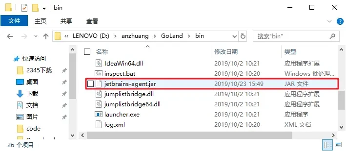 将下载好的文件解压,并将破解补丁“jetbrains-agent.jar”复制到 Goland 安装目录下的 bin 目录中,放到这里没有什么特殊的意义,只是为了防止误删。