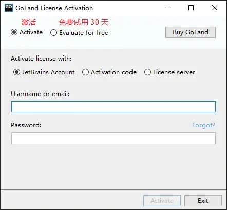 点击 OK 后发现需要激活,免费试用的话也仅有 30 天的时间,这就尴尬了!别急下面就来告诉大家怎么破解它。首先点击 Exit 关闭正在运行的 Goland 程序。