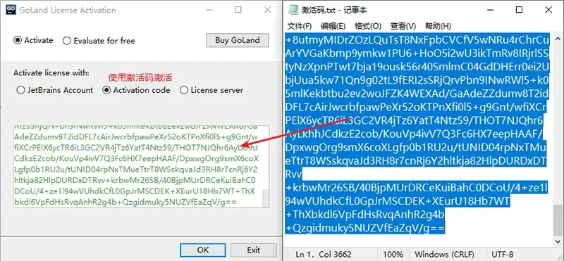 运行 Goland 进入激活界面,选择“Activate”,激活方式选择“Activation code”使用激活码激活,并将激活码粘贴到下面,点击 OK 即可。激活码可以在下载的破解补丁中找到。