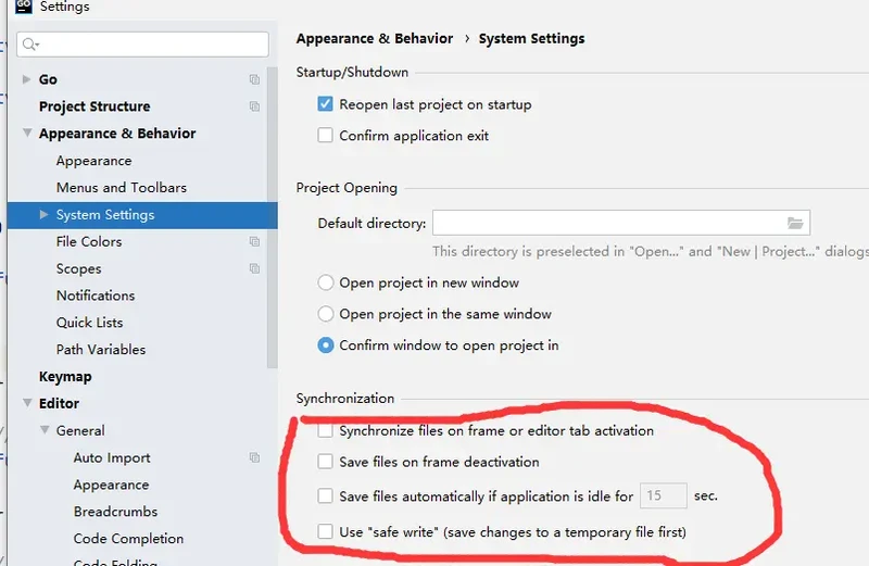 第一个是激活当前窗口时保存,第二个是切换到其他窗口的时候(当前窗口没有被激活)保存,最后一个是重点,其实是关掉最后一个选项就好,那个叫安全写入,方法就是重命名源文件,只要能重命名成功就会覆盖掉源文件来达到安全自动保存的目的,所以这个安全会不停的保存源文件。关掉这个选项就只会在很少的情况下自动保存。所有的四个选项全部关掉就只能手动保存。