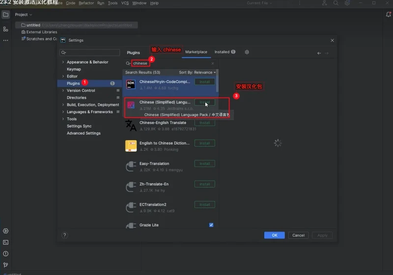 2. 找到 plugins,然后搜索 chinese, 安装中文包