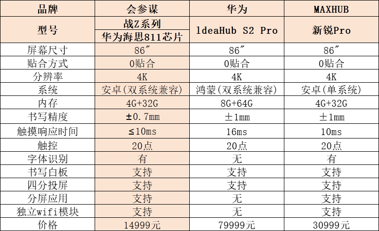这是MAXHUB旗下的畅销产品之一。配置4K超清显示屏,影像表现优秀;支持20点触控,可实现10ms超低书写延迟,书写精度达±1 mm,在触控响应时间上比华为的要精进一些;支持书写白板、四分投屏功能,对比起华为那款还多了分屏应用、字体识别功能,而且配置有独立WiFi模块;内存为4G+32G,比华为那款内存较低,不过日常办公也够用了。值得注意的是,不同于华为和会参谋(Leaderhub)可以两个系统随时切换,MAXHUB这款智能会议平板仅兼容安卓或Windows单系统运行,日常办公碰上多个设备的话,在系统兼容这一块可能会不方便。在价格方面,据京东商城官方旗舰店价格,该型号86寸规格售价为元,性价比在三款中属于中等。
