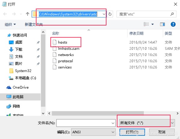 3、在弹出的窗口中右下角下拉菜单选择“所有文件”,然后依次找到X:\windows\system32\drivers\etc\hosts文件,X表示系统盘,一般是C盘。