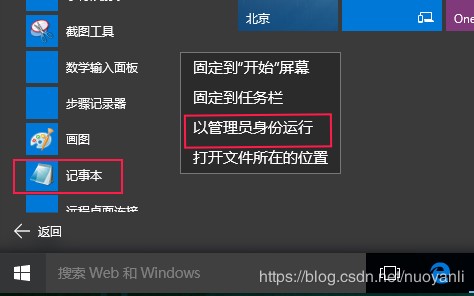 1、开始——所有应用——windows附件——记事本,右键选择“以管理员身份运行“。