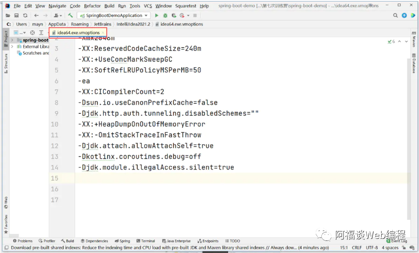 这个文件中,我们需要把破解补丁中的 FineAgent.jar 文件,配置到 idea64.exe.vmoptions 文件中。