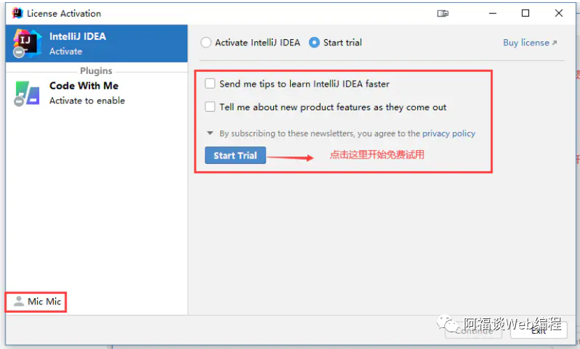 2 Start trial,免费体验 IDEA,不过在新版本中需要注册帐号登录才能体验