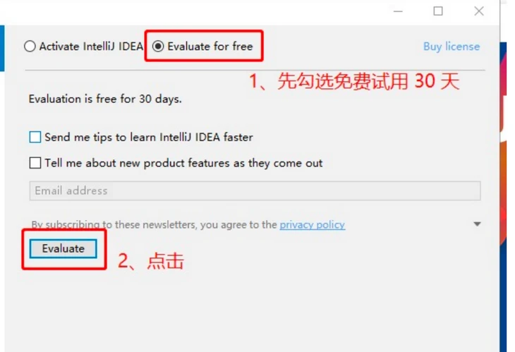 DEA 2021.3 运行, 中间会先弹出一个注册框,我们勾选 Evaluate for free, 点击 Evaluate, 先试用30天: