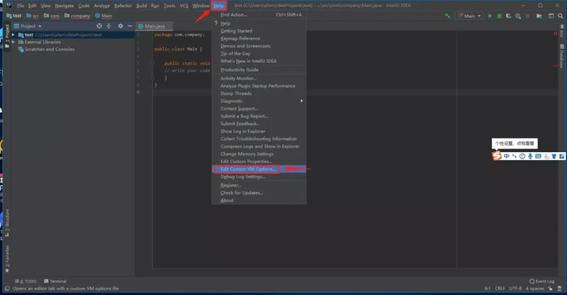 进去过后,我们随便建个项目,点击菜单栏 Help -> Edit Custom VM Options: