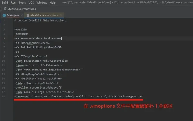 在 .vmoptions 文件中配置我们补丁放置的全路径位置