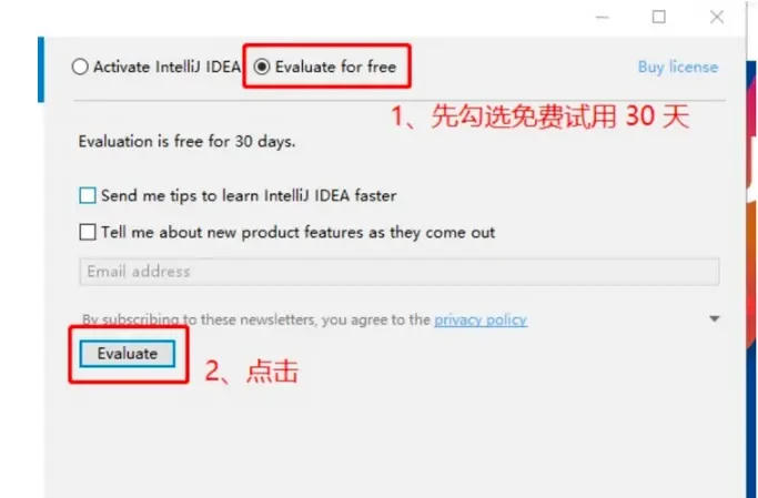 DEA 2021.3 运行, 中间会先弹出一个注册框,我们勾选 Evaluate for free, 点击 Evaluate, 先试用30天: