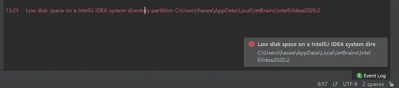 3.1 启动IDEA后右下角提示错误:Low disk space on a IntelliJ IDEA system directory partition