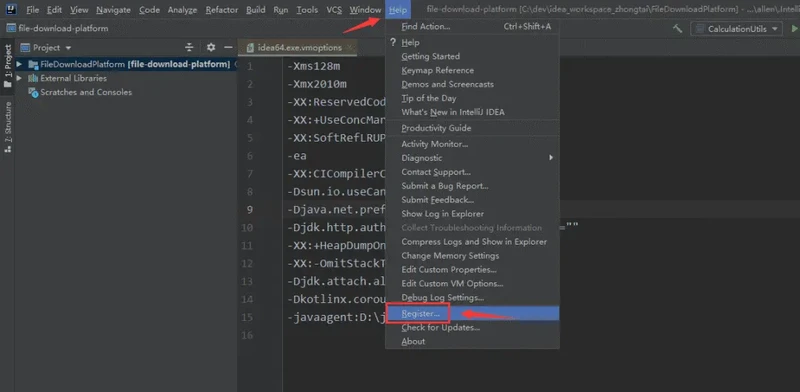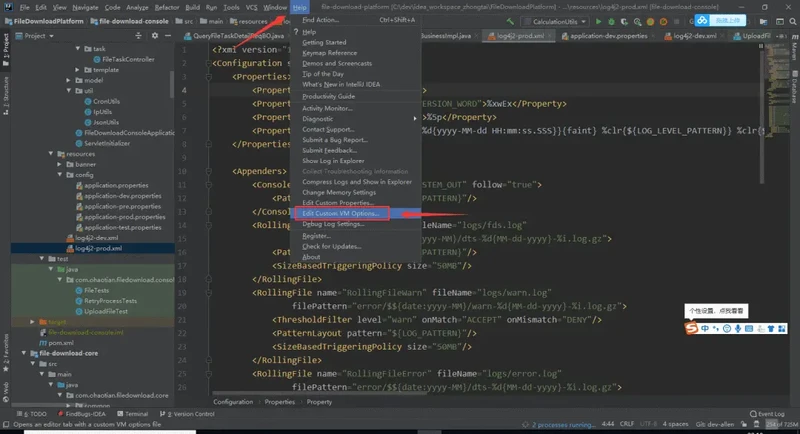 或者你也可以随便创建一个项目/或者打开个旧的项目,点击顶部的Help 菜单 -> Edit Custom VM Options 来打开: