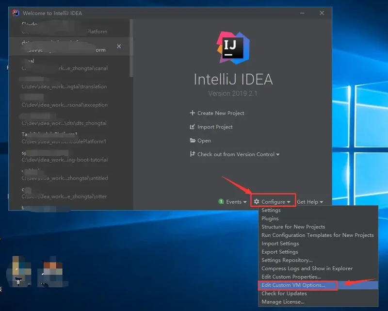 成功进入 IDEA 以后,点击 Configure ->Edit Custom VM Options: