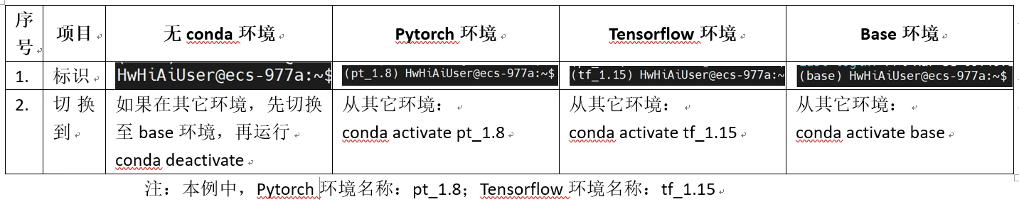 安装完成后,系统存在下述四种环境:无Conda环境;Pytorch环境;Tensorflow环境;Base环境。四种环境切换方式如下表所示: