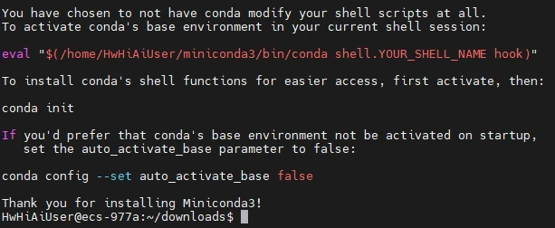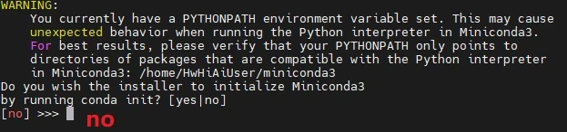 此处选择no,选择yes,登录后会自动运行conda的base环境。等需要使用时,通过