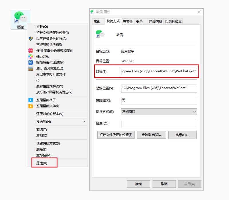 1.打开微信桌面图标的属性,复制其所在目标路径。
