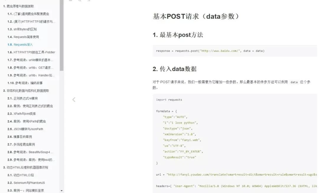 这份资料非常全面,从 Python 基础、到 web 开发、数据分析、机器学习、深度学习、金融量化统统都有,该手册是 HTML 版本,左侧是目录,可以点击,右侧是对目录知识点的讲解,适合 python 学习者,对某些知识点不熟悉的话,将页面保存到浏览器书签,可以快速在没网的情况下查找知识点,总计有 200 多页!