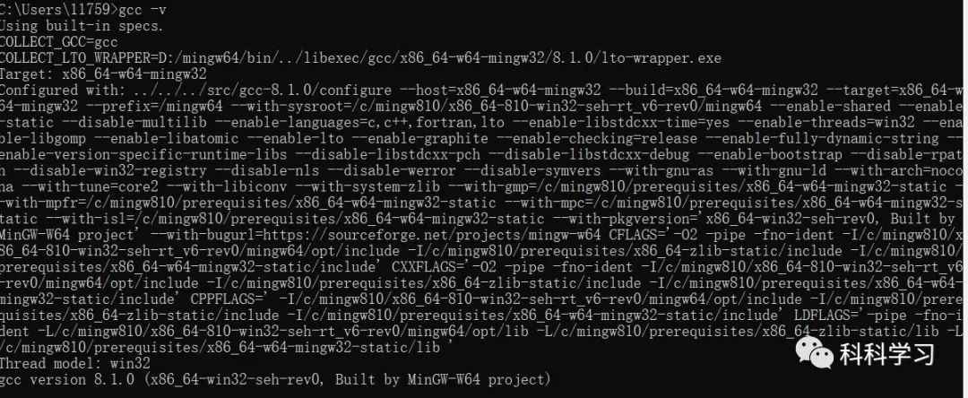 使用命令 gcc -v 查看版本 出现以下信息证明环境配置成功(有的需要重启)