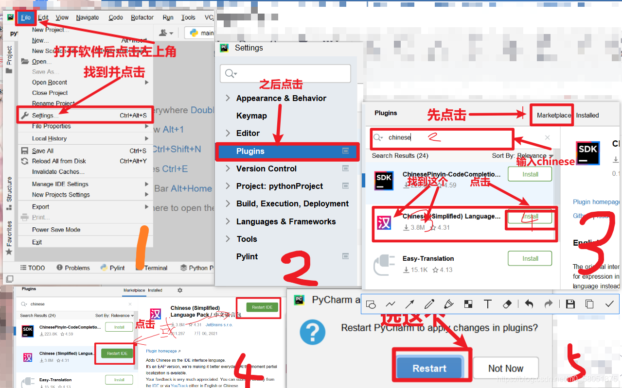 在plugins界面先点击markelplace,然后在搜索框输入chinese就可以看到插件安装后重启软件就是中文