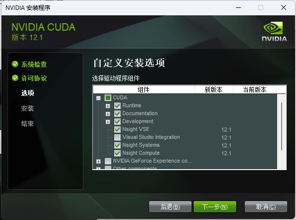 若报错nsight visual studio edition安装失败,则也不勾选Nsight VSE;