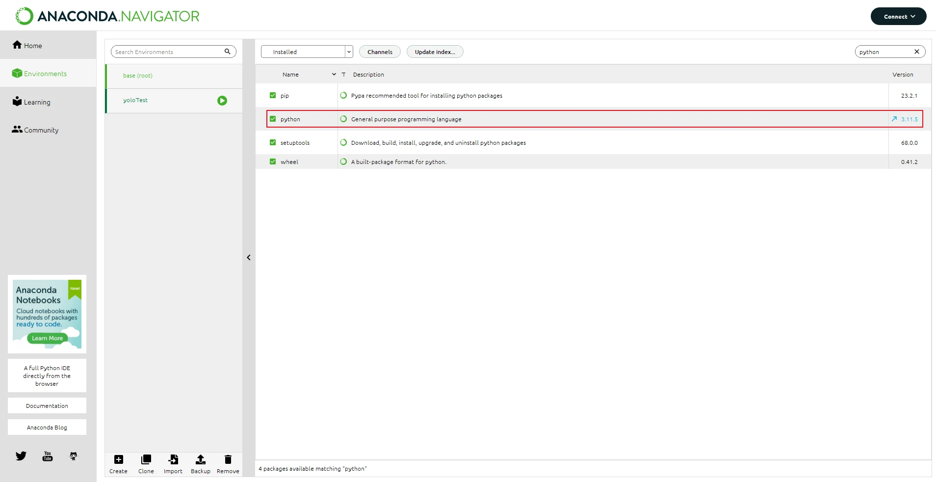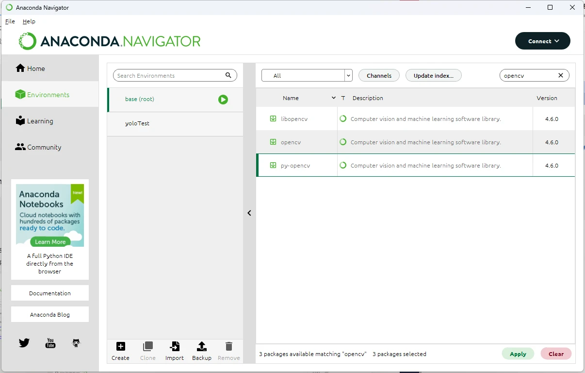 打开【anaconda navigator】-yolov5test,点选下图所示【Enviroments】,将下拉单选成【ALL】,然后搜索【opencv】,选中点击apply完成了安装。