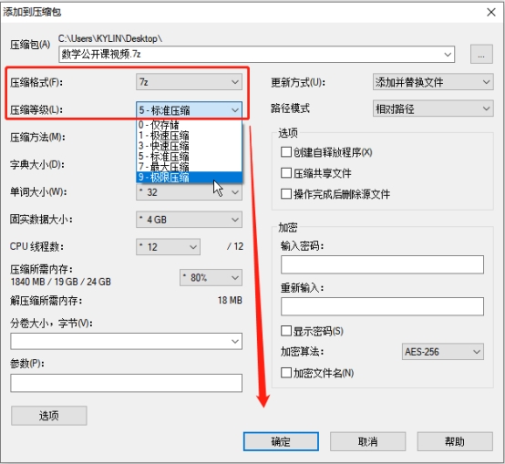 2、选择压缩文件的格式和设置压缩级别。手动调整更高的压缩级别,点击“确定”按钮开始进行文件压缩。