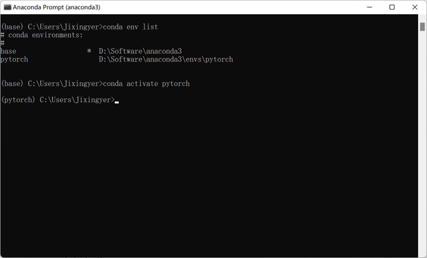 我们在创建环境之后,需要激活环境,如在第一步中,默认激活环境为base环境,我们现在将需要将pytorch环境激活。使用命令conda activate pytorch激活该环境: 激活环境