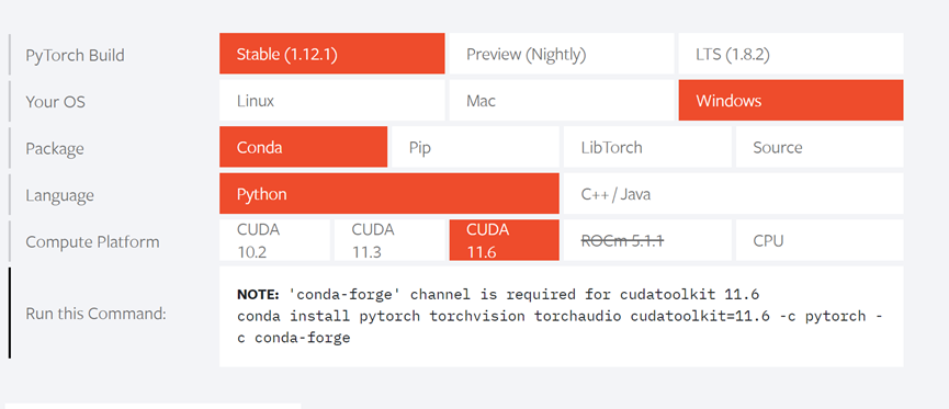 复制命令conda install pytorch torchvision torchaudio cudatoolkit=11.6 -c pytorch -c conda-forge进行安装: 安装pytorch