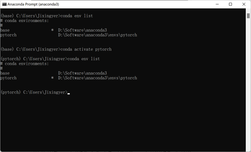 上图可见前面括号中已经变成(pytorch),说明已经激活pytorch环境。可再次使用conda env list命令查看已有环境进行验证,*号在pytorch环境上: 查看已有环境