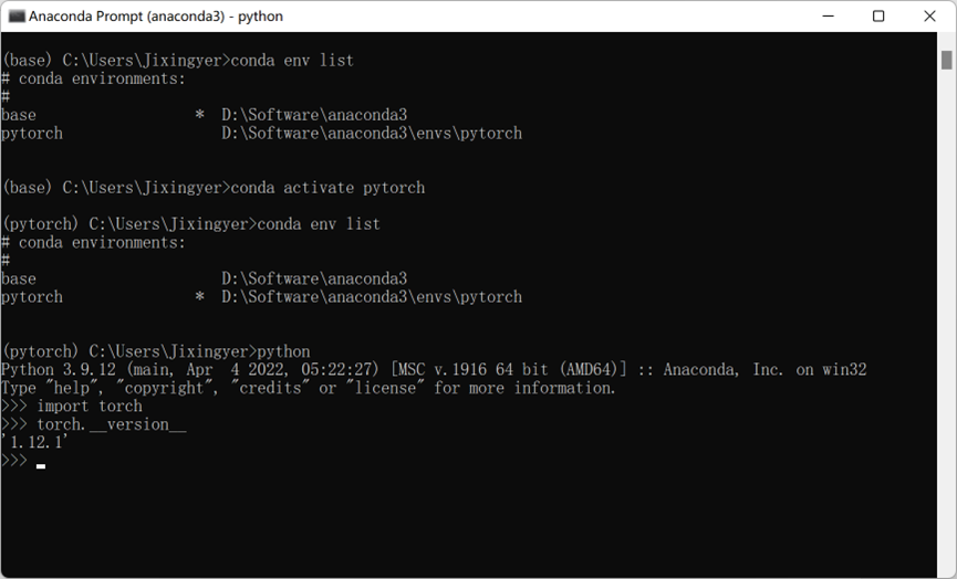 可见python版本3.9.12,继续依次输入import torch和torch.__version__: 查看pytorch版本