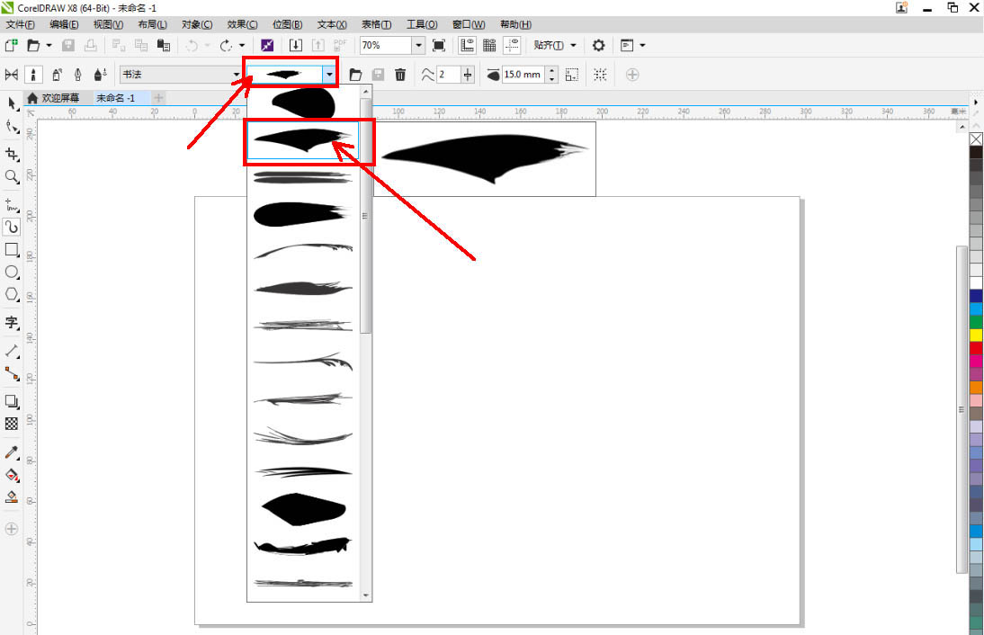 2、点击【艺术笔工具】,选择【喷涂】-【书法】,按图示选择一款书法笔触图案;
