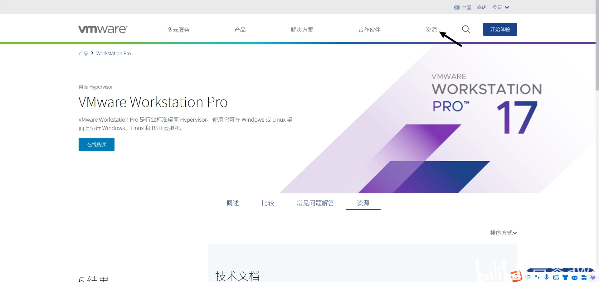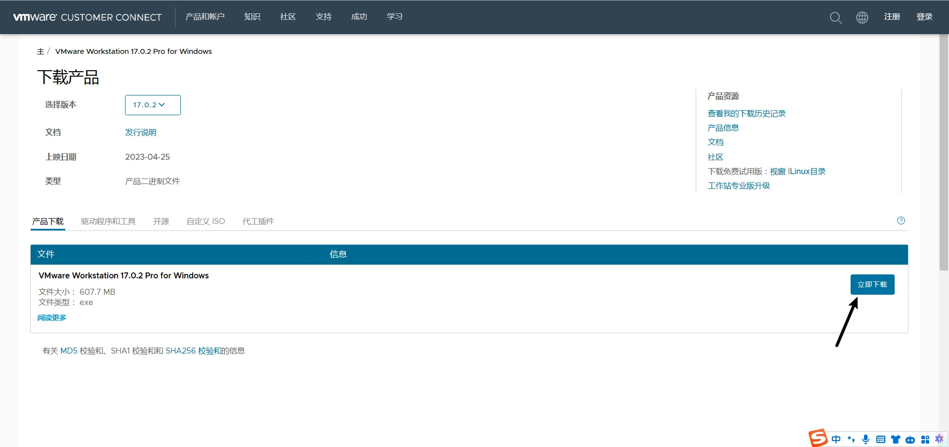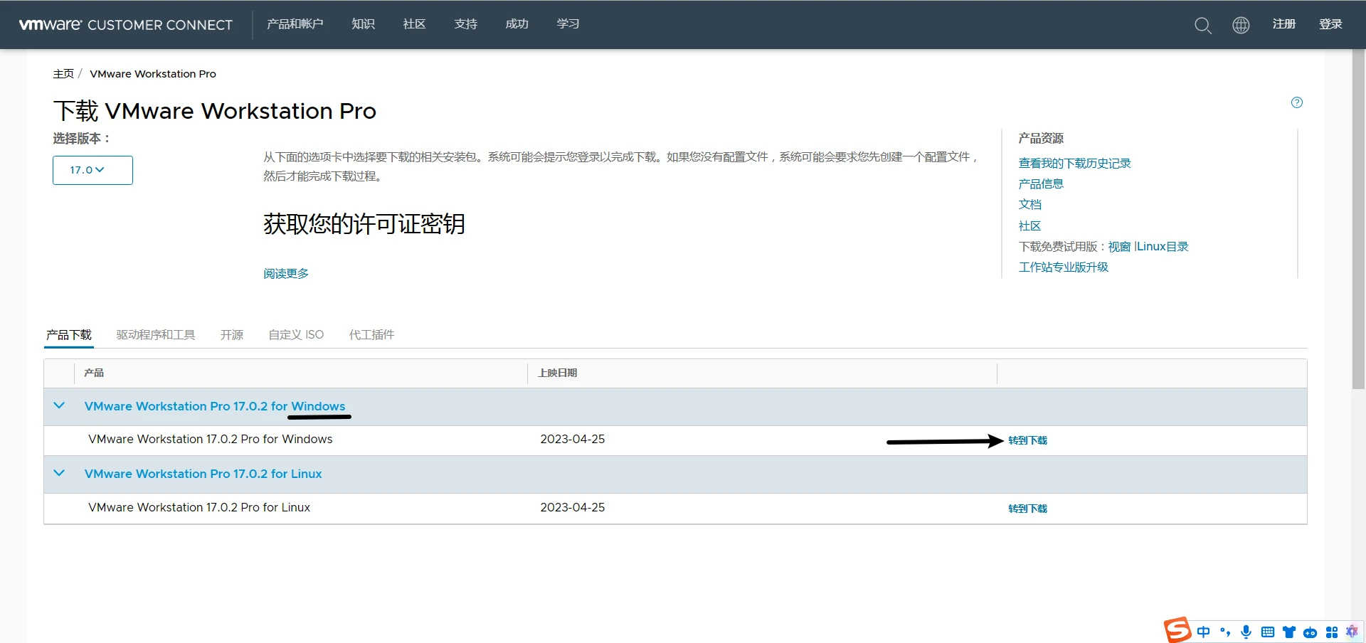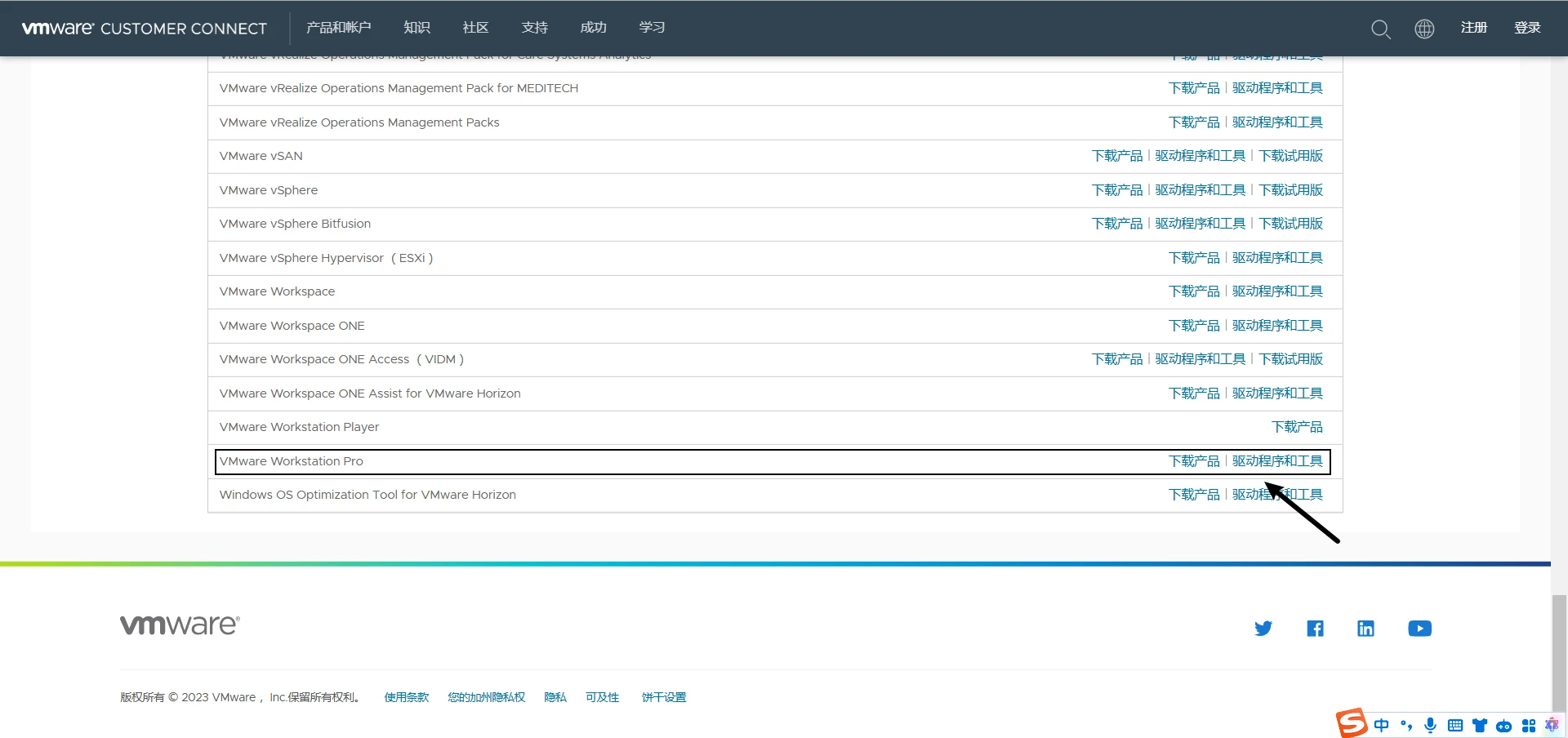 翻到网页最下面(热知识:Home键可以到达网页最底部)并点击“VMWare Workstation Pro”右边的“下载产品”按钮