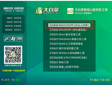 1.启动U盘后,启动BIOS设置,返回大白菜PE界面,按【启动Win10X64PE(2G以上内存),然后回车进入PE界面,选择【启动Win10X64PE)。