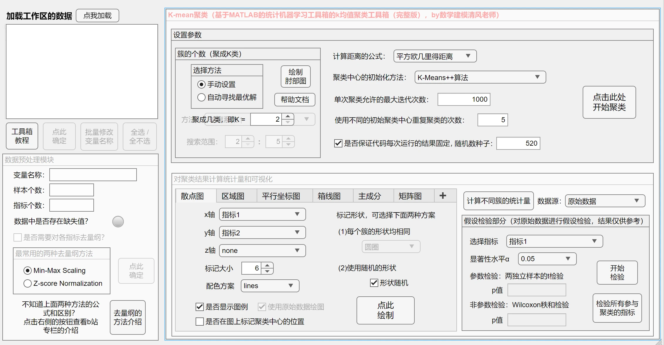 MATLAB的机器学习工具箱和深度学习工具箱都非常强大,然而官方对于无监督学习中的聚类迟迟没有一个很完善的工具箱,于是我开发了该工具箱,该工具箱不仅能得到聚类结果,还支持自动生成代码帮助大家复现结果。