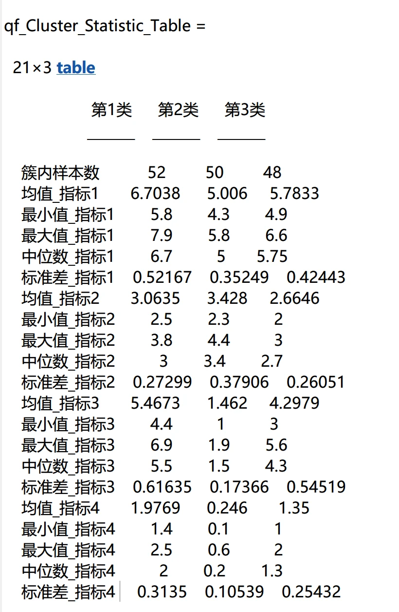 除了可视化外,还能一键计算各个簇中各指标的均值、最值、中位数等统计量: