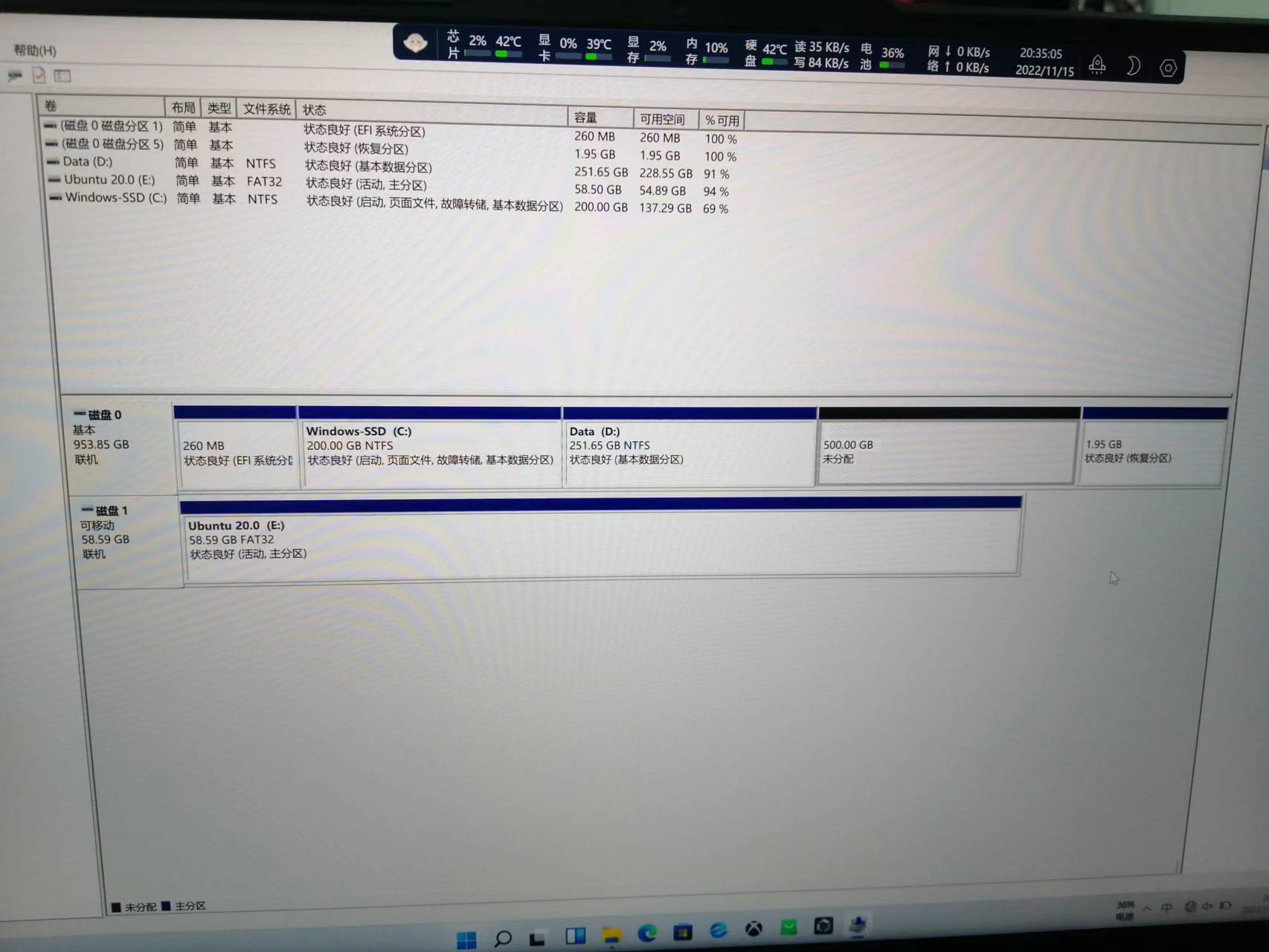 一、分区,磁盘管理,如下图分出来500G的空闲区域用于安装Ubuntu系统