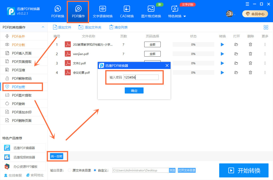 如果你想要对转换的文档进行PDF加密,可以点击PDF操作——PDF加密,拖入文档,点击“统一加密”输入加密密码就可以开始转换啦!