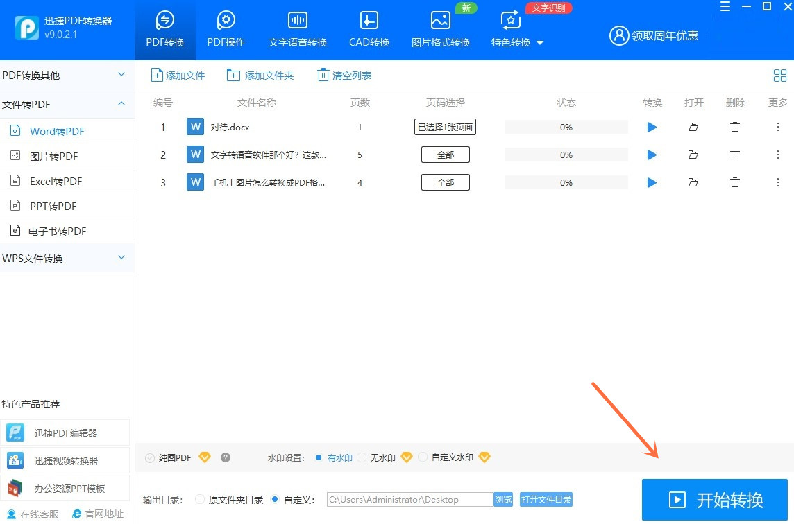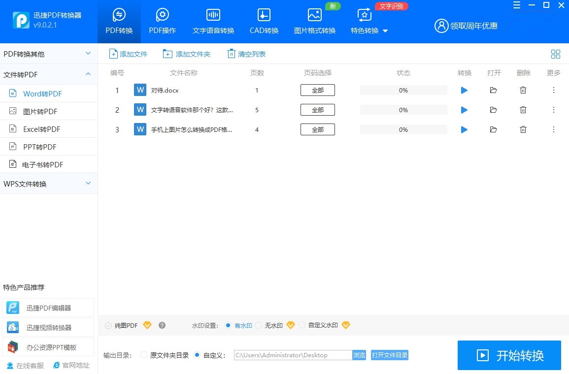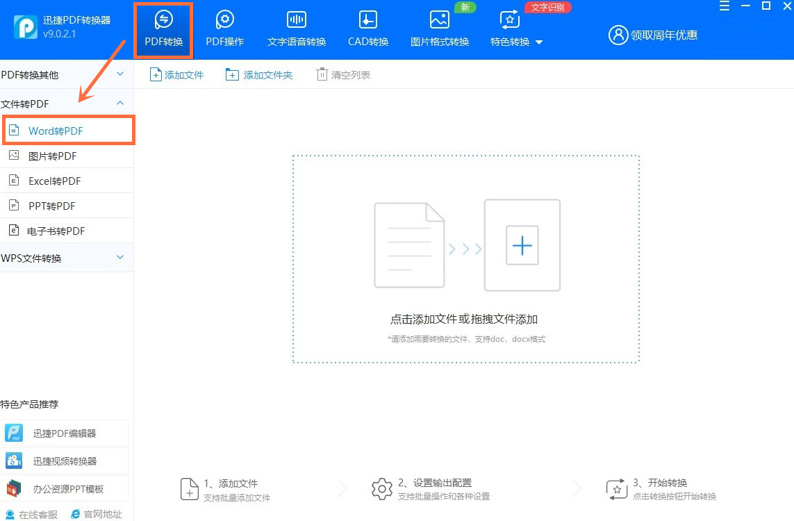 首先,打开软件,可以看到有PDF转换、PDF操作、文字转语音等众多功能。根据自身需求,点击PDF转换——word转PDF。