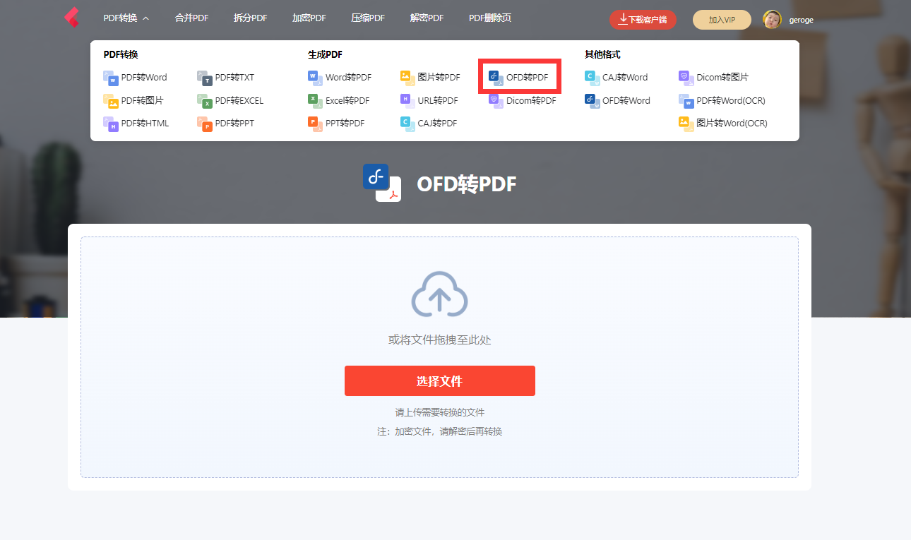 首先我们需要在网页中选择OFD转PDF/Word的功能,在这里我们就以OFD转PDF举例。