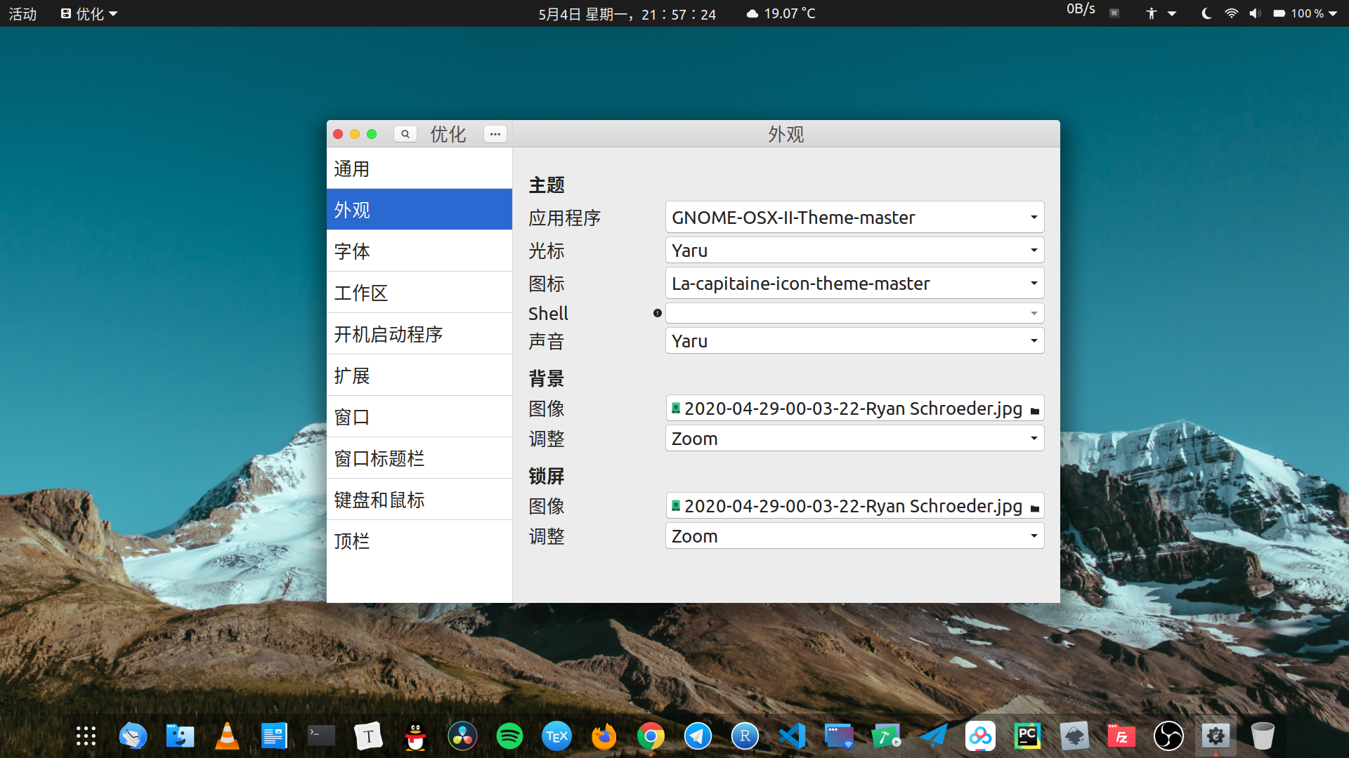 2.安装美化主题https://www.gnome-look.org/p/1275087/](https://links.jianshu.com/go?to=https%3A%2F%2Fwww.gnome-look.org%2Fp%2F1275087%2F)下载mojave-light-solid.tar.xz文件并解压,之后终端执行 sudo nautilus 命令,找到下载的主题文件夹右击将其移动到 usr-share-themes 文件夹下.打开 gnome-tweak-tool在主题栏选择下载的主题3.安装美化图标https://github.com/keeferrourke/la-capitaine-icon-theme 下载美化图标,解压之后终端执行 sudo nautilus命令,移动到usr-share-icons文件夹下. 打开 gnome-tweak-tool选择下载好的图标文件.