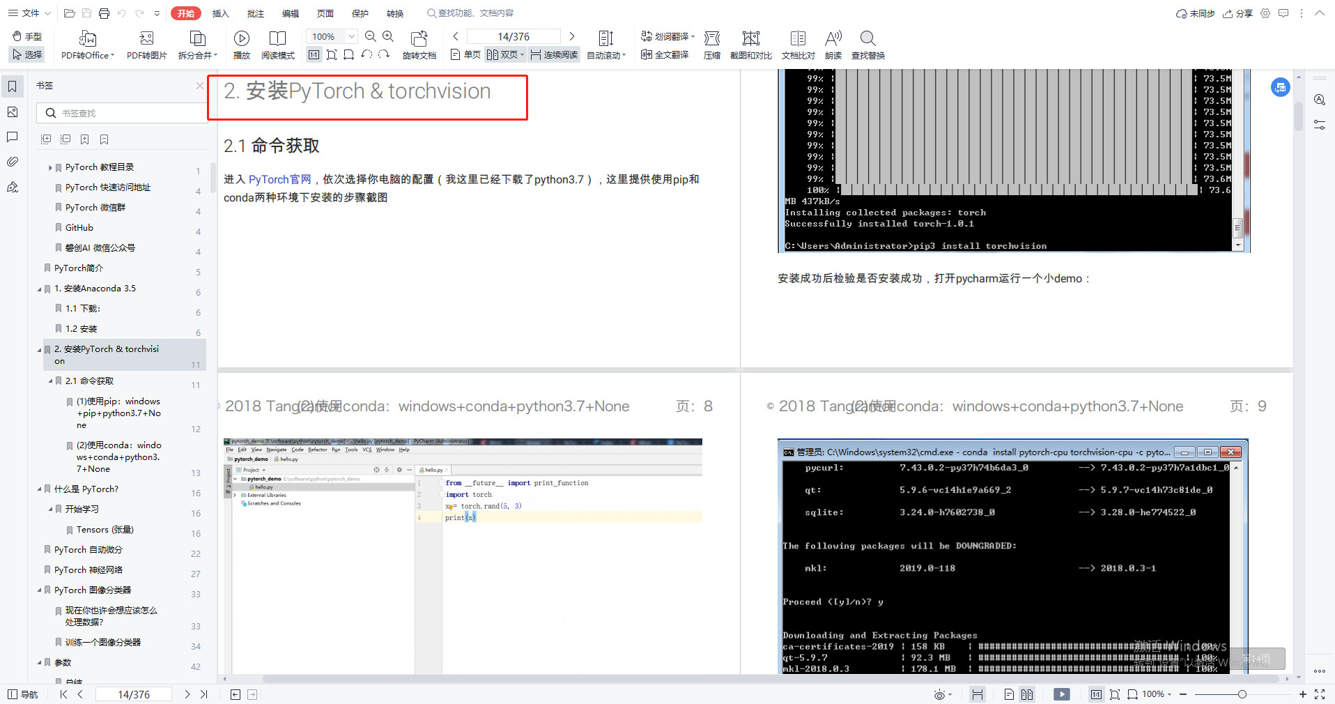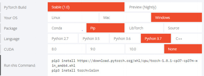 首先需要进入 PyTorch官网,依次选择你电脑的配置(我这里已经下载了python3.7),这里提供使用pip和conda两种环境下安装的步骤截图。