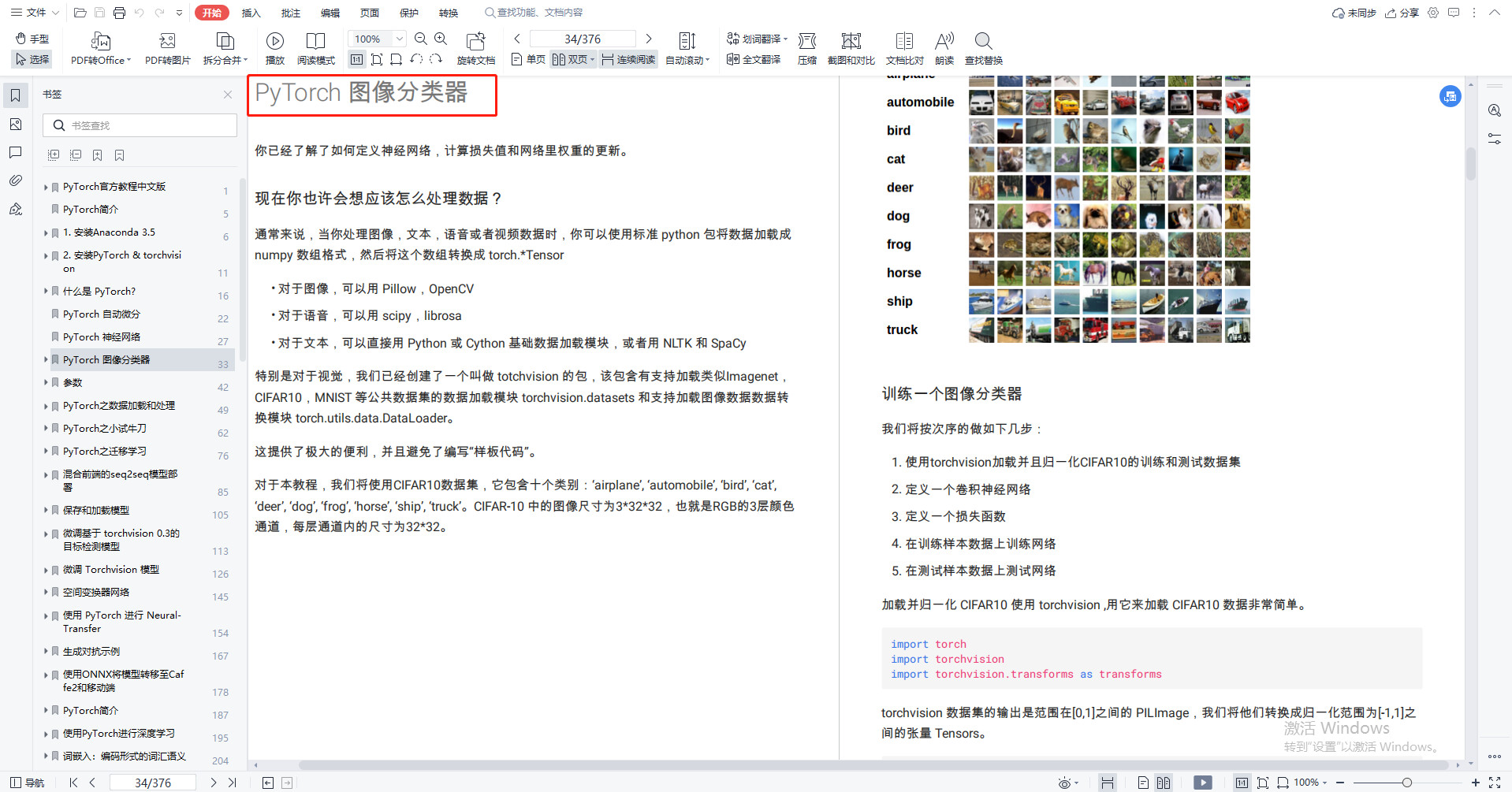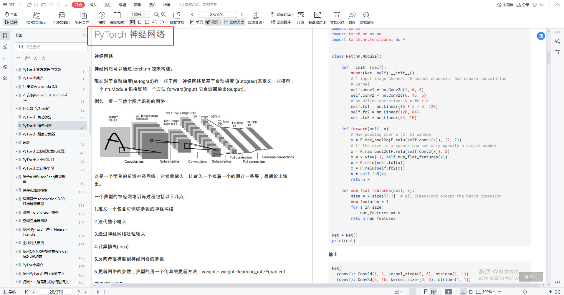 四、神经网络:现在对于自动梯度(autograd)有一些了解,神经网络是基于自动梯度 (autograd)来定义一些模型。一个 nn.Module 包括层和一个方法 forward(input) 它会返回输出(output)。