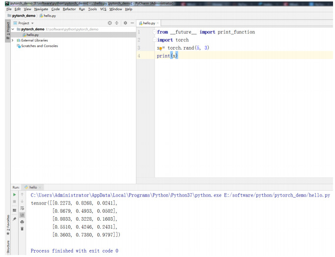 安装成功后检验是否安装成功,打开pycharm运行一个小demo: