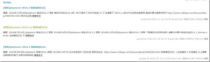 以前在博客园发布的3篇关于phpstorm激活的文章,累积有20万的阅读量。后来不知怎么的在百度上就搜索不到了,看了一下文章在博客园也被下架了。