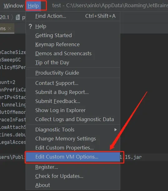 3.进入Help>Edit Custom VM Options检查一下javaagent是否配置成功?如图所示: